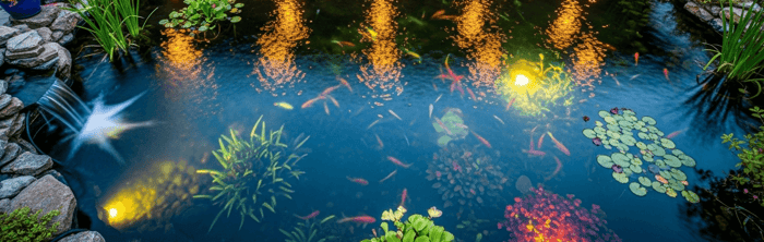 Lighting also has practical benefits — it helps deter predators and highlights waterfalls, plants, or fish for a striking nighttime display.