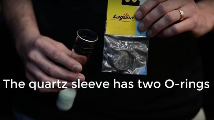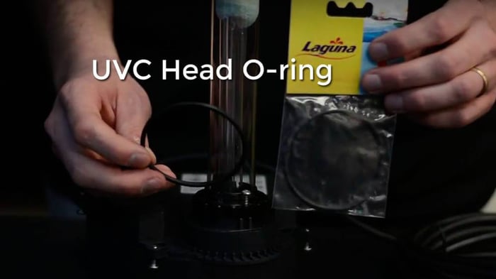 We can start with the Fittings. These are located inside the click-fit connection port and are an orange/red color so they're hard to miss. Next, we can move onto the UVC head. This O-Ring is located on the underside here. While we have the UVC out and upside down, we can replace the two on the quartz sleeve. These are located at the base of the sleeve behind under retaining flange. To access, pull the sleeve straight up after the flange is removed.