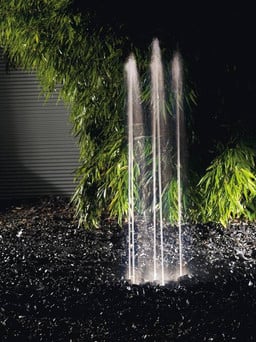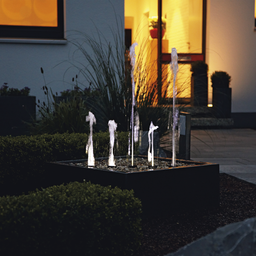 The Water Quintet offers 5 fountains of varying heights (12-55 inches) and light intensities. The Plug’n Spray feature allows for immediate use. The fountain’s remote control provides convenience and flexibility. The fountain can set up on a range of substrates and has a robust floor plate for protection. The fountain boasts an energy-efficient 12-volt technology.The fountain includes 5 pumps/nozzles, external control unit, transformer and cables.